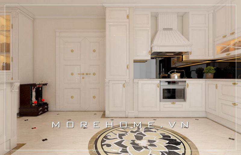 Mẫu thiết kế nội thất phòng bếp gỗ tự nhiên sử dụng tone màu trắng theo phong cách tân cổ điển sang trọng và tinh tế