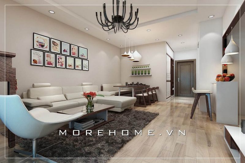 Không gian phòng khách căn hộ thêm sang trọng thu hút với tâm điểm là mẫu sofa bọc da cao cấp kết hợp tone trắng tinh tế được thiết kế theo phong cách hiện đại trẻ trung.