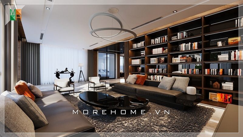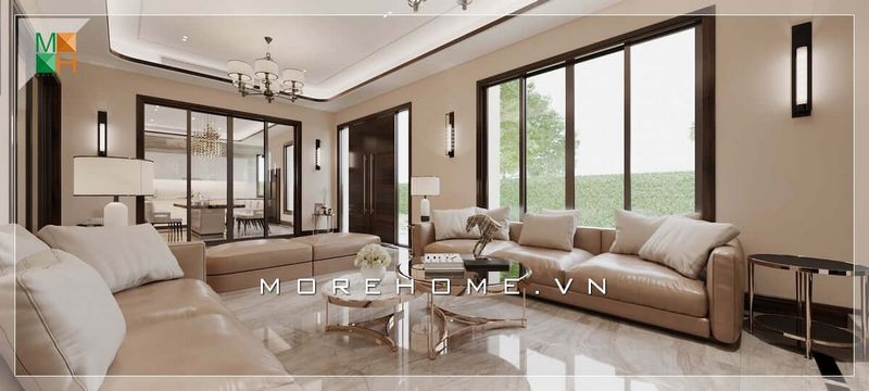 Ấn tượng với vẻ đẹp sang trọng của không gian phòng khách biệt thự, nhà phố với tâm điểm là bộ sofa màu nâu trầm bọc da cao cấp được thiết kế kiểu góc theo phong cách hiện đại đầy tinh tế.