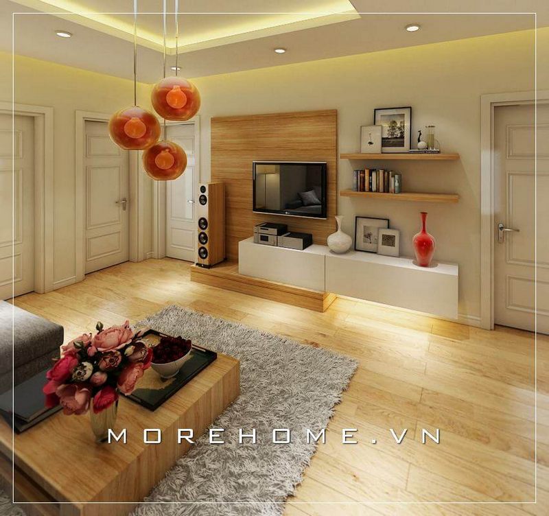 Khu vực phòng khách chung cư được thiết kế theo lối hiện đại với nội thất gỗ công nghiệp tạo cảm giác tinh tế và thoáng máy