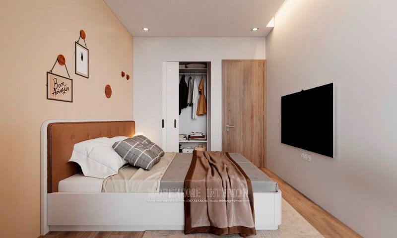 Giường ngủ gỗ công nghiệp phong cách hiện đại, trẻ trung, phần chân gỗ kiểu dáng thấp tạo độ thông thoáng cho phòng ngủ chung cư nhỏ