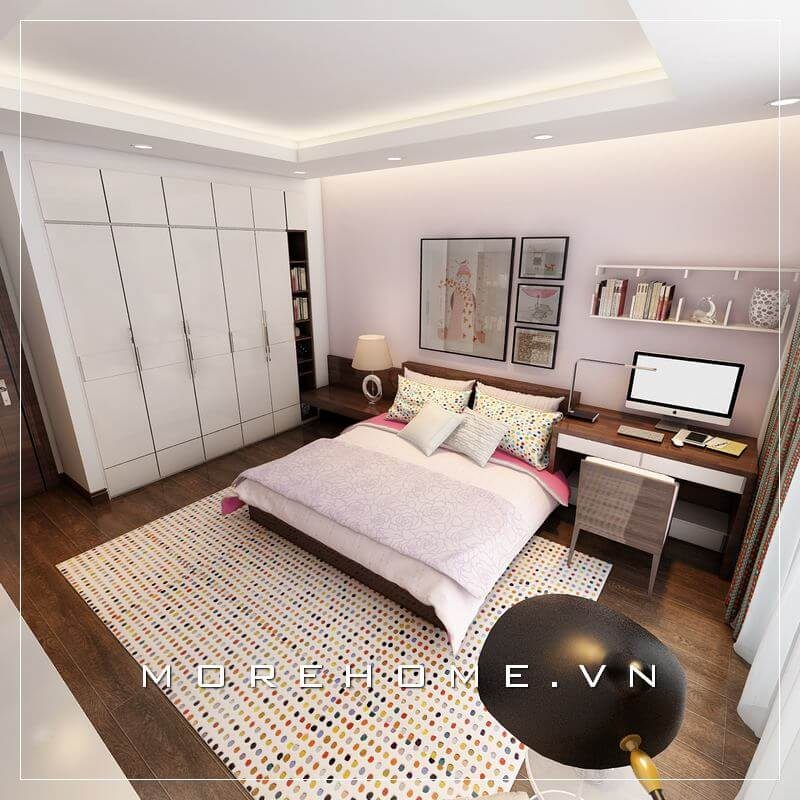 Mẫu giường ngủ chung cư màu trắng được thiết kế theo phong cách hiện đại, trẻ trung và không kém phần sang trọng