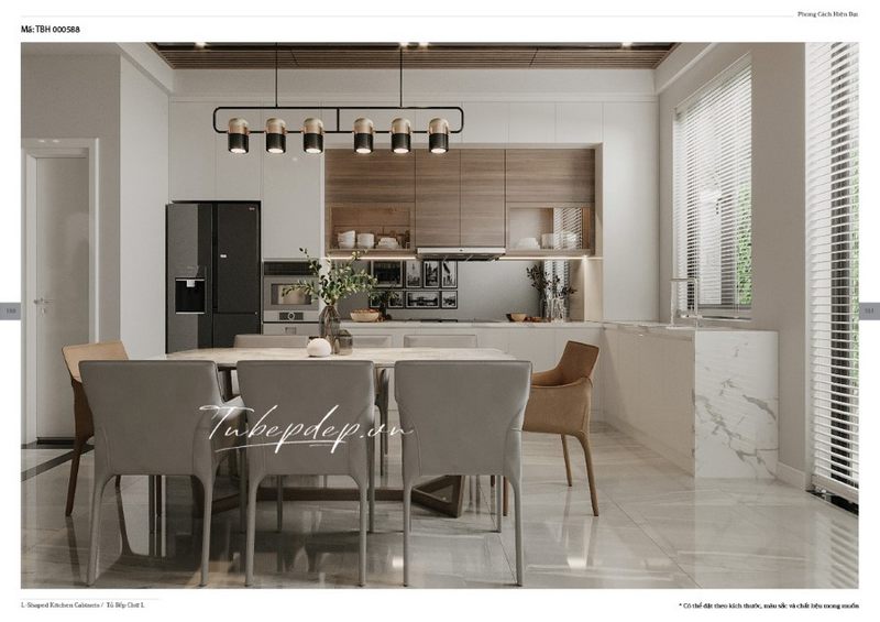 Tư vấn thiết kế phòng bếp liền phòng ăn cho biệt thự, nhà phố chuẩn hiện đại với hệ thống tủ bếp gỗ công nghiệp nhiều ngăn và bộ bàn 8 ghế thanh thoát, thời thượng