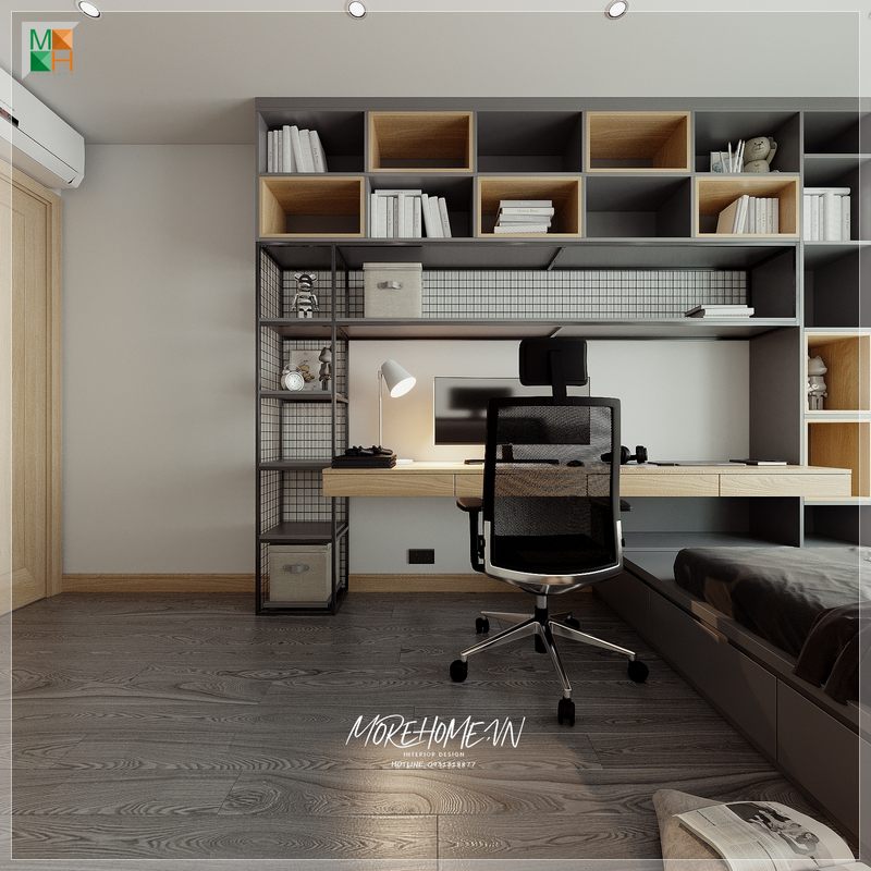 Bàn làm việc hiện đại được thiết kế liền kề với giường ngủ, gia chủ có thể làm việc và nghỉ ngơi thoải mái, nhanh chóng hơn