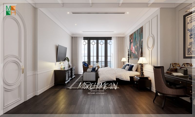 Giường ngủ master độc đáo với đường nét tân cổ điển từ gỗ óc chó kết hợp cùng gam trắng nhẹ nhàng đã tạo nên không gian phòng ngủ sang trọng, thanh lịch.