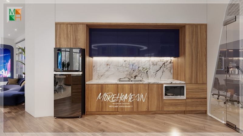 Đồ nội thất văn phòng showroom hiện đại sử dụng gỗ công nghiệp An Cường đẹp: bàn làm việc, kệ sách ốp tường, tủ kệ trưng bày sản phẩm,...