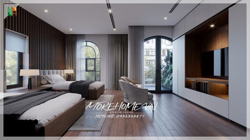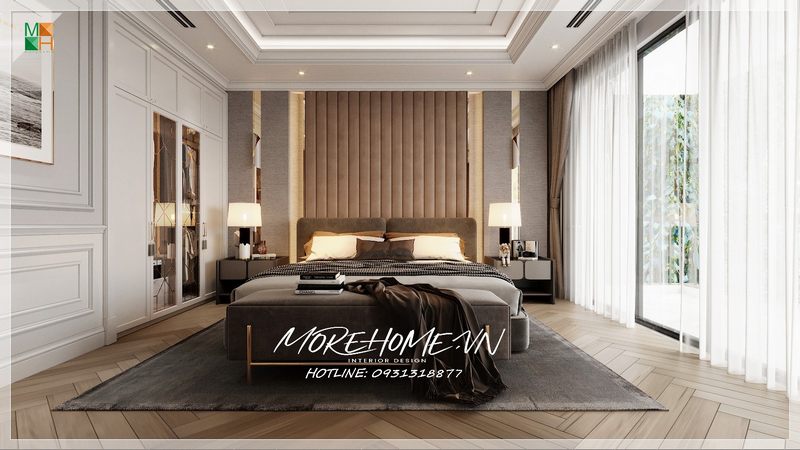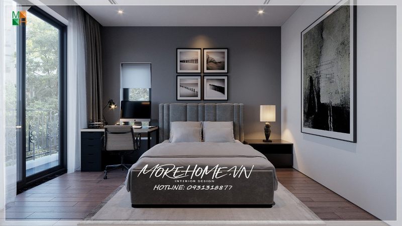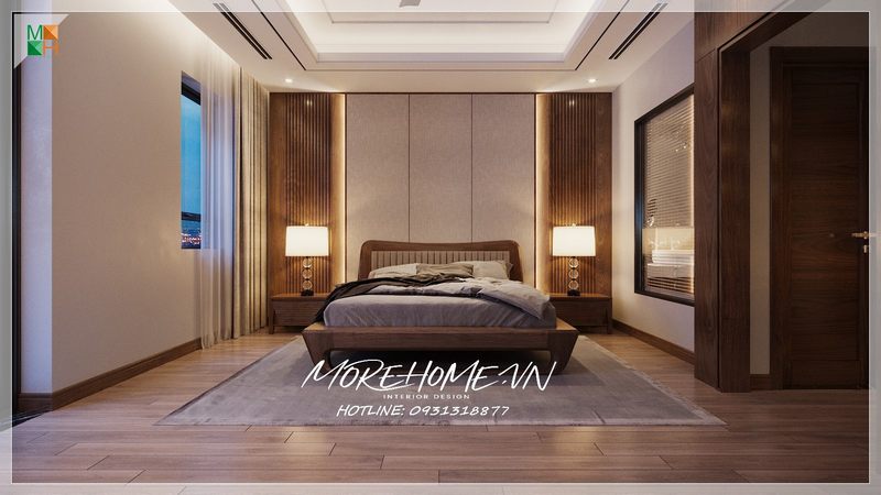 Tap đầu giường hai bên được đặt đèn ngủ hiện đại tạo sự tiện nghi và thuận lợi trong quá trình sử dụng và là nội thất trang trí thêm cho không gian phòng ngủ.