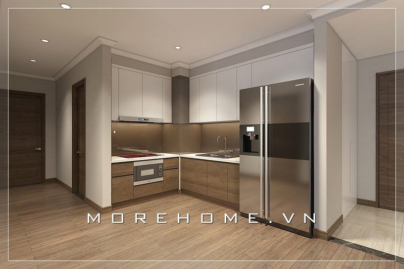Thiết kế tủ bếp âm tường gỗ công nghiệp màu sáng giúp không gian ấm cúng rộng rãi hơn