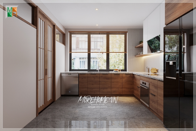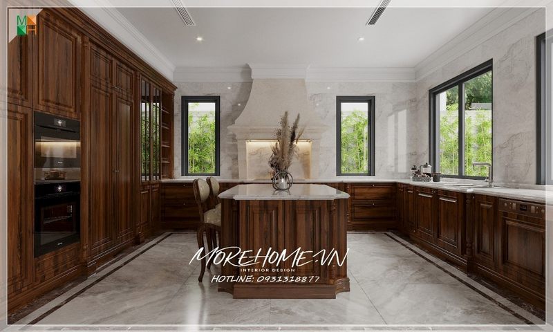 Phòng bếp thiết kế nội thất kiểu tân cổ điển với màu sắc nhẹ nhàng sâu lắng từ hệ thống tủ bếp khiến không gian trở nên thoáng đãng hơn