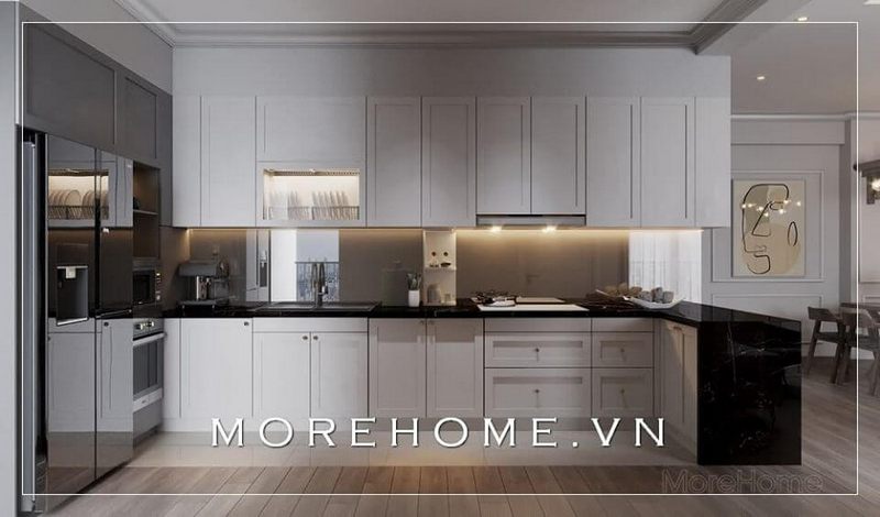 Thiết kế phòng bếp chung cư với nội thất tone màu trắng hiện đại, trẻ trung