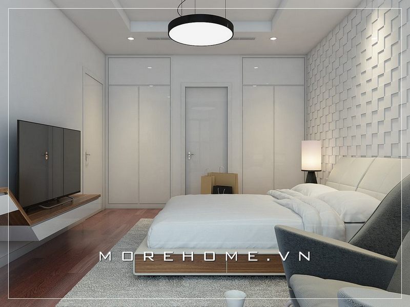 Tủ quần áo hiện đại màu trắng đầy tinh tế, nhã nhặn, được thiết kế kịch trần tạo cho căn phòng thêm cao và thoáng hơn