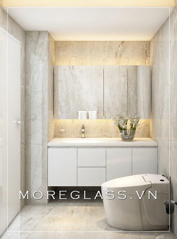 Gương trang trí phòng vệ sinh đơn giản, không có bo viền và được lắp ốp trên tường.