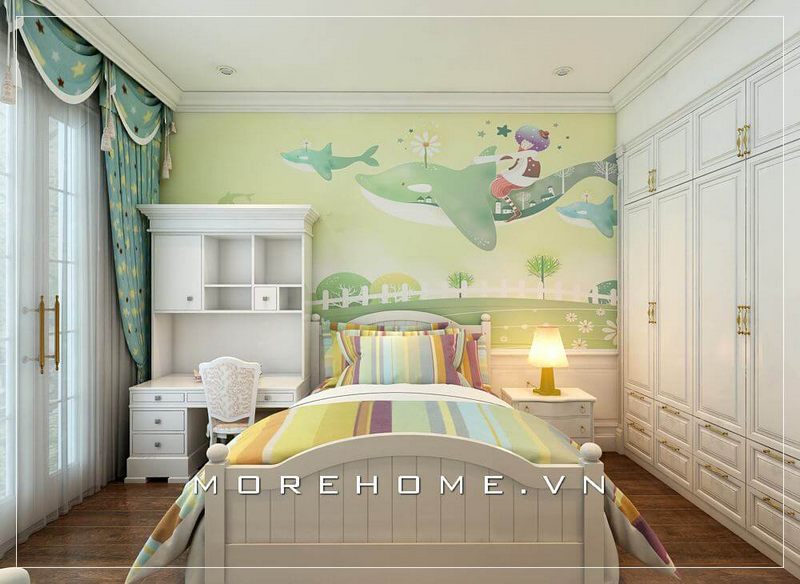 Nội thất phòng ngủ con gái được làm từ chất liệu gỗ tự nhiên phun sơn màu trắng sang trọng và được kết hợp với giấy dán tường hoa lá, để tạo nên một không gian sinh động hơn.